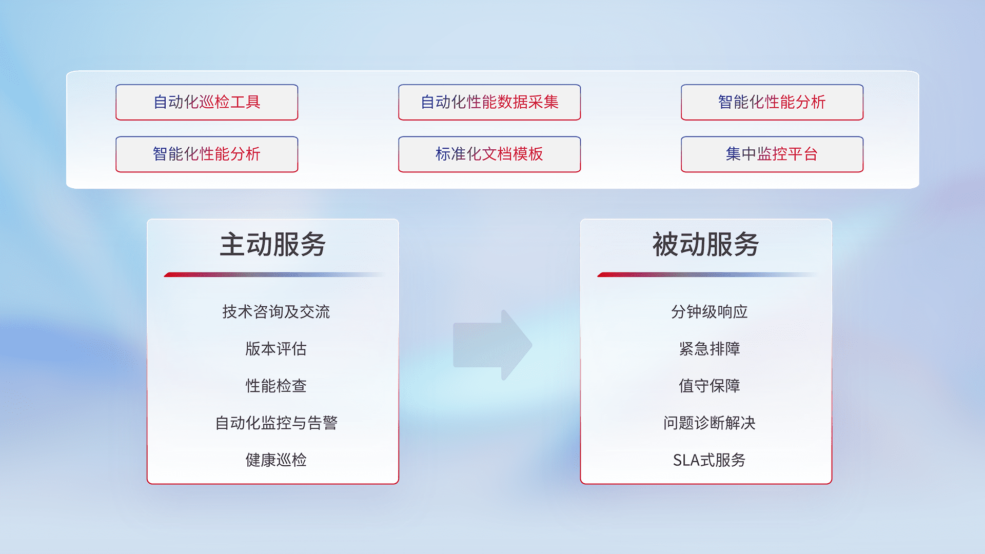 智能化工具和标准化文档,,,保障服务质量,,提供主动服务(包含技术咨询、、、、版本评估、、、、性能检查、、自动化监控与告警、、、健康巡检)和被动服务包含(分钟级响应、、、紧急排障、、、、值守保障、、、问题诊断解决、、SLA服务)。。。。